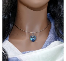 Magnifique collier ras de cou argenté orné d'un cristal autrichien cœur 18x17,5 mm Aquamarine monté sur trois fils cablés.